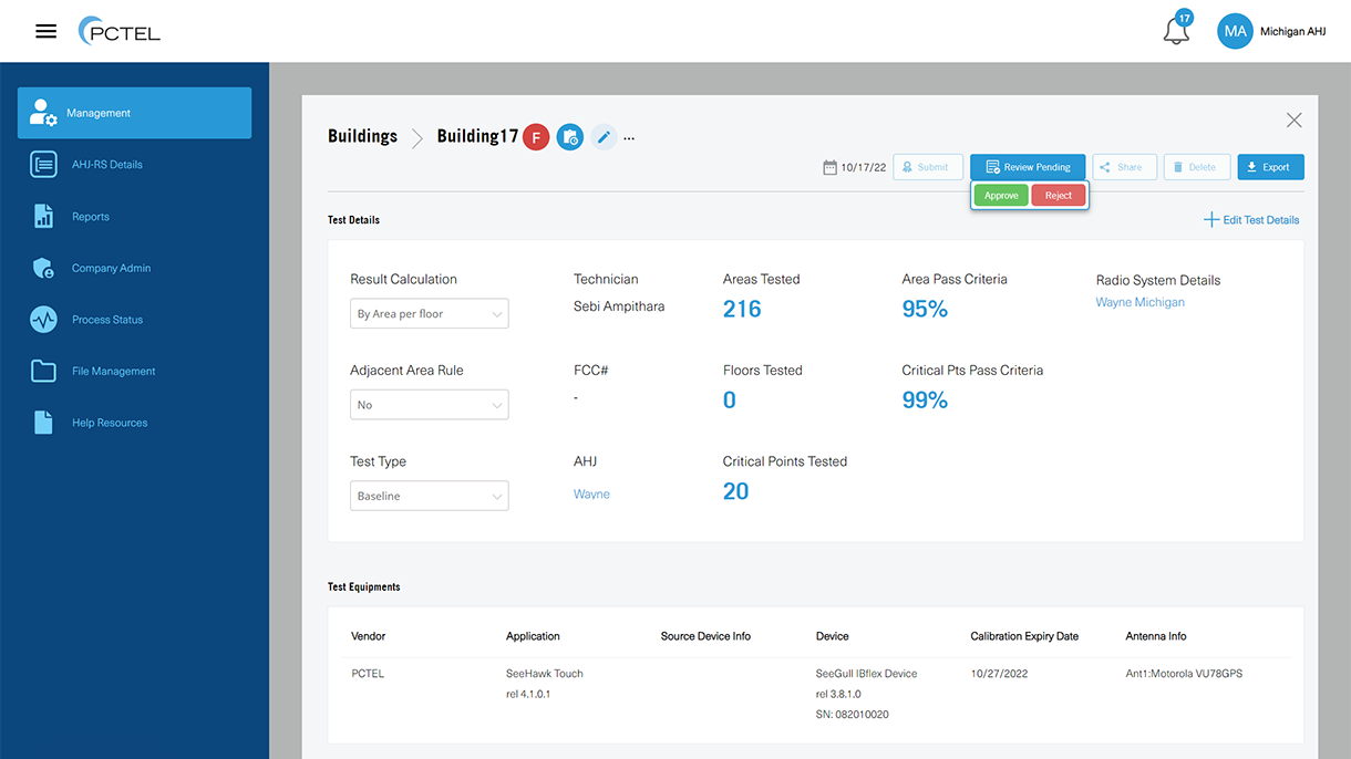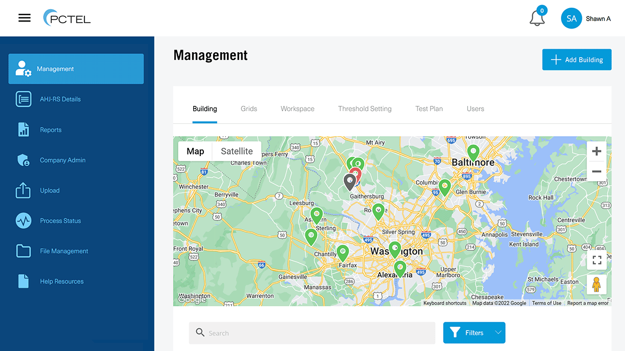 SeeHawk Central is a cloud-based workflow management platform for testing, approving, and tracking in-building critical communications coverage and Emergency Responder Communication Enhancement Systems (ERCES) such as bi-directional amplifiers (BDAs). It makes testing with PCTEL solutions even more efficient, improves collaboration between testing services and public safety agencies, and provides an easy-to-use secure database of building, BDA, and radio site information.